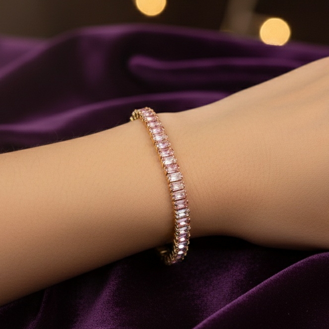 Add refined sparkle to your jewelry collection with this Elegant Baguette Crystal Tennis Bracelet. Featuring a sleek row of precisely cut baguette stones set in a polished gold-tone finish, this timeless piece delivers brilliant shine from every angle. Available in red, white, and pink, it’s perfect for special occasions or elevating your everyday style with a touch of luxury.