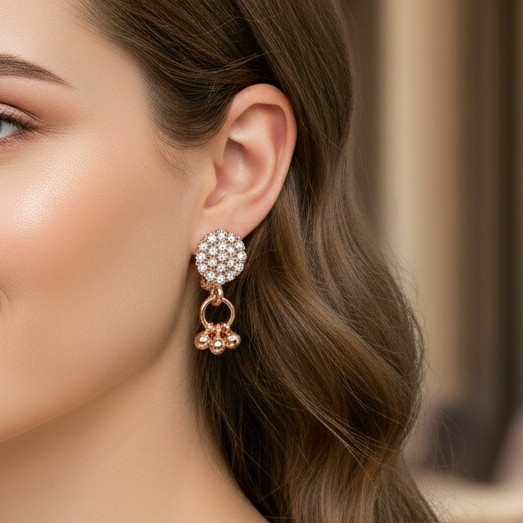 Add a touch of feminine elegance to your look with these Rose Gold Crystal Charm Drop Earrings. Featuring a sparkling crystal-studded stud paired with a delicate rose gold charm, this design beautifully blends sophistication with modern glamour. Perfect for both special occasions and elevated everyday wear, these earrings offer graceful movement, radiant shine, and lightweight comfort for all-day elegance.